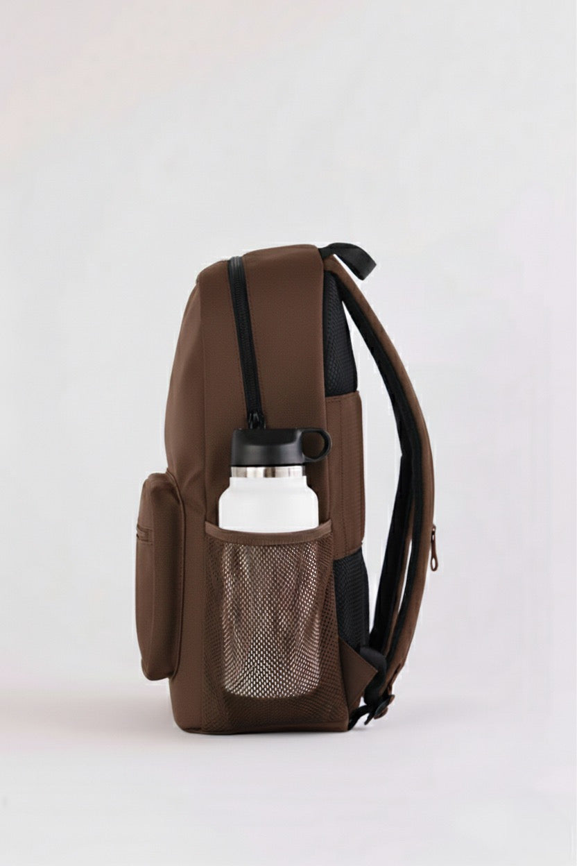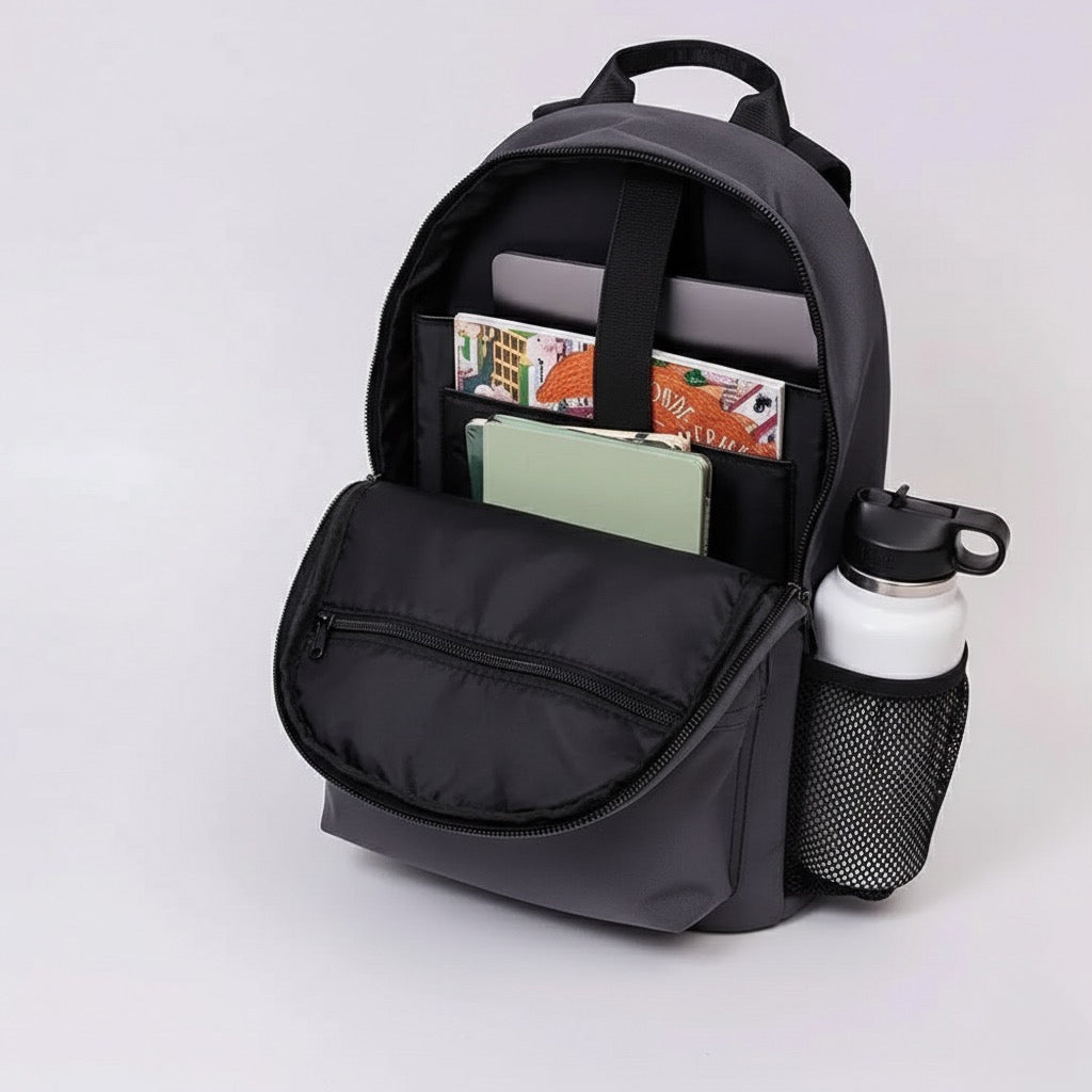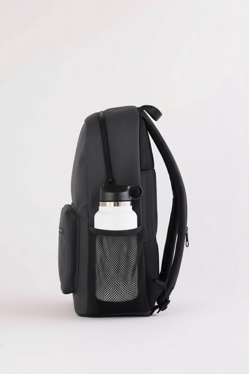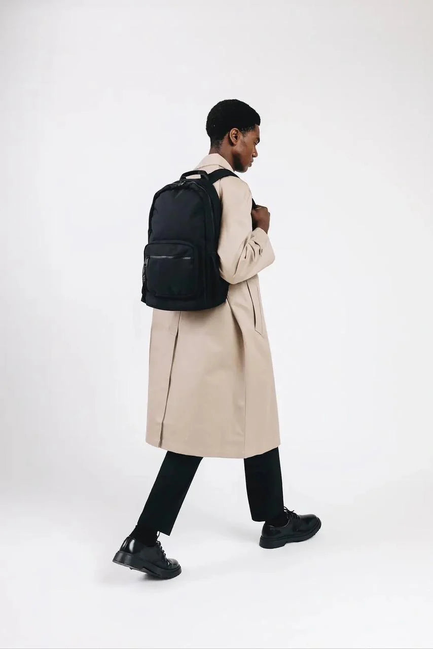 The Overtop Classic is the ultimate backpack for those who need versatility and style. whether you're heading to work, traveling, or hitting the gym, this backpack adapts to your lifestyle. crafted with high-quality materials and a sleek design, it's a timeless addition to any wardrobe. with water-resistant fabric, your essentials stay protected, while the YKK zippers ensure durability and security. the classic has multiple compartments, including a laptop sleeve, tablet sleeve, and a removable drawstring bag for gym clothes or shoes. it also features two stretchable water bottle holders, a luggage sleeve, and 10 additional pockets to keep you organized. the adjustable padded shoulder straps and padded back ensure all-day comfort, while the mesh interior pocket and vegan leather trim add a touch of luxury. designed for practicality and style, the classic is your go-to companion for any occasion. plus, its sustainable approach means you can carry with confidence, knowing you've made an eco-friendly choice. discover the backpack that does it all β€” your new favorite, the classic.